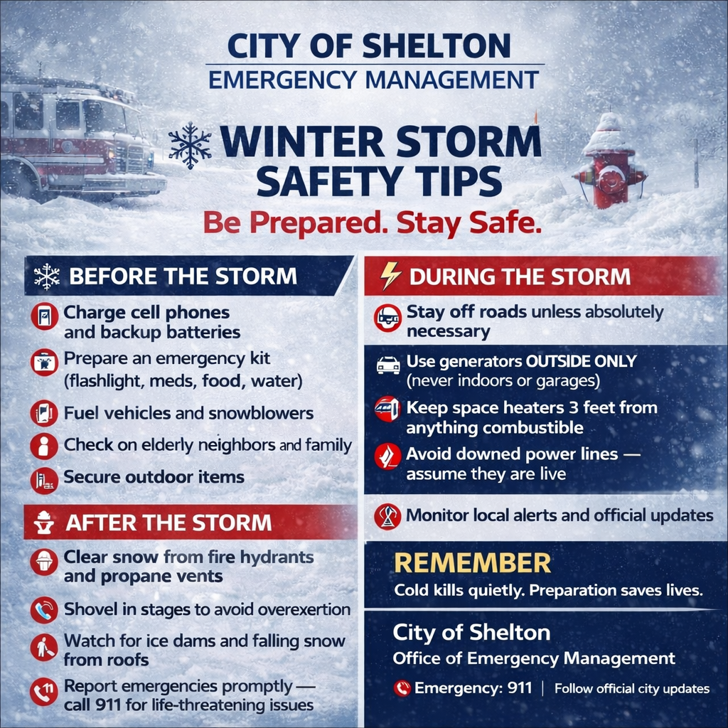 Due to Winter Storm Benjamin Tuesday January 27, 2026 The following schedule will be usedSenior Center to open at 11:00AMAll other City Buildings and Departments to open at 10:00AM